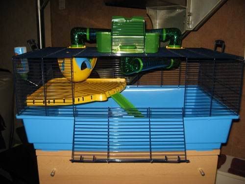 Die buizen gebruikt hij (nog) niet en dat hanghuisje ook niet. 't Is maar een klein hamstertje ook hé ;)